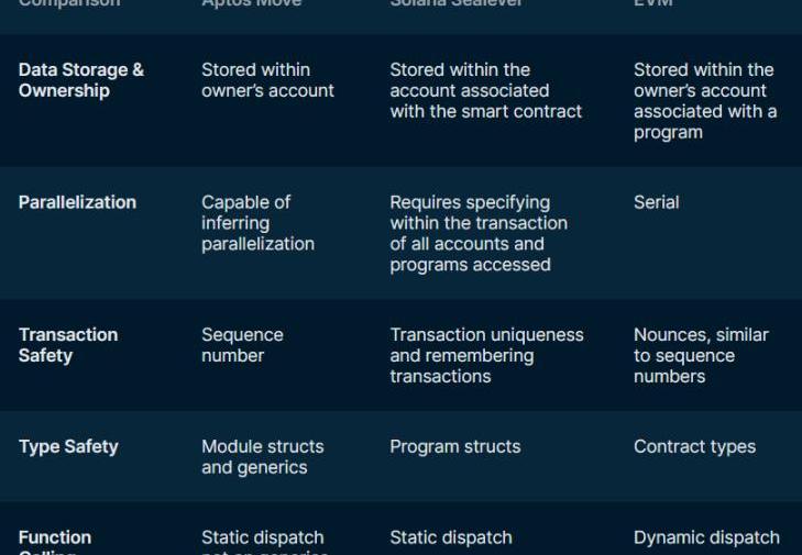 查看上面将Block-STM性能与块的顺序执行进行比较的测试结果,有32个线程并行工作,网络能够以低延迟和低延迟时间处理惊人的160,000TPS。那么现在问题来了,Aptos是如何实现这种性能的呢?这真的要归功于它的协作调度器和它的多版本控制技术,这有助于网络提高效率。协作调度程序通过以下方式提供帮助:防止重复工作:虽然每个中止的事务都会重新执行,但同一个事务永远不会被多个线程同时执行。确保安全性:如果重新执行事务,则必须重新验证所有更高级别的事务。结果,相同的事务执行可能会由不同的线程同时验证,但最多可以中止它。正确排序:遇到依赖关系的事务在解决依赖关系后恢复。Aptos的并行执行引擎可能会改变现有的MEV技术,因为现在对事务进行排序,或者在一个或多个块中重新排序以优化并行执行的并发性。MovevsSolidity语言安全性对比