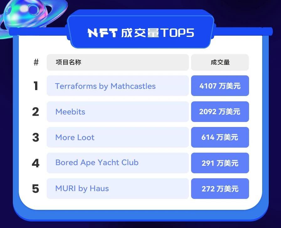 按过去24小时成交量,排名前五的项目分别为TerraformsbyMathcastles、Meebits、MoreLoot、BoredApeYachtClub和MURIbyHaus。