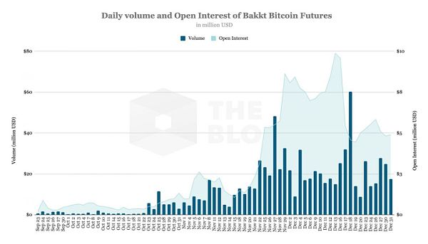 2019年9月底,Bakkt推出了实物交割的BTC期货。上线初期,交易额和未平仓合约数都很低,但是在十月底开始增长,并于12月18日创下单日6000万美元的成交量记录。