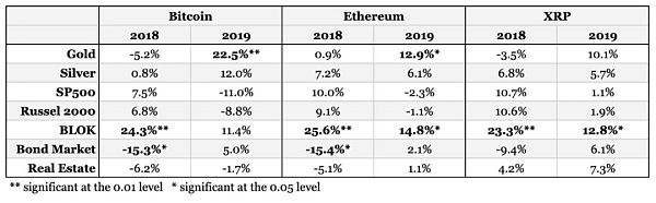 ▲2018和2019年BTC、ETH、XRP与黄金、白银、标普500指数等各大市场的相关性