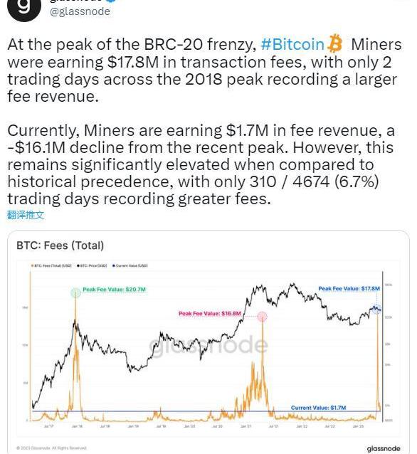 结果,比特币矿工的收入在过去几天缩水了。在BRC20炒作的高峰期,矿工收入达到1780万美元的峰值。