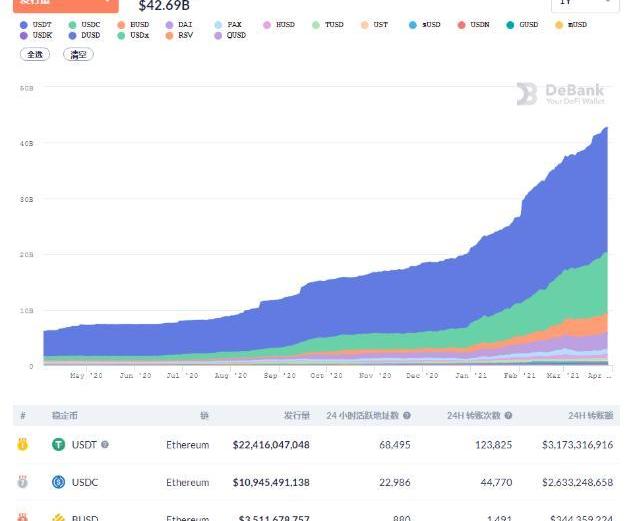 在加密市场中,2020年-2021年稳定币得到了突飞猛进的发展。截止今天,稳定币市值已经接近430亿美元。在整个稳定币当中,USDT现在仍是带头大哥,其资产规模已经突破224亿美元。