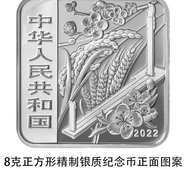8克正方形银质纪念币背面图案以虎、春牛、鱼为主要设计元素,展现立春时节“鱼陟负冰”物候现象、“打春牛”习俗,并刊“立春”字样及面额。